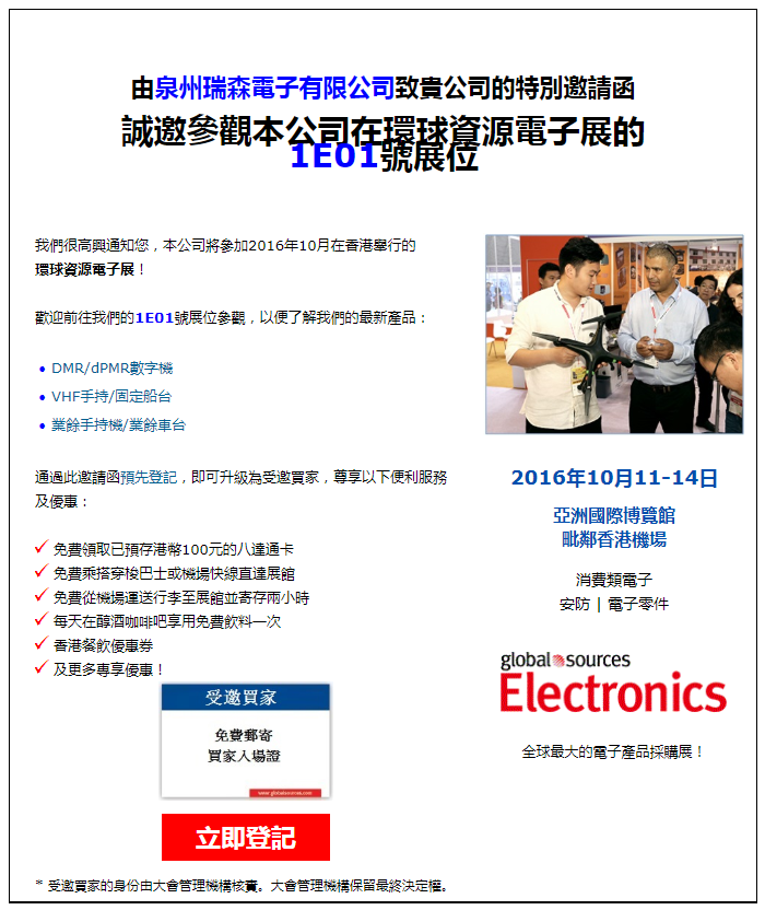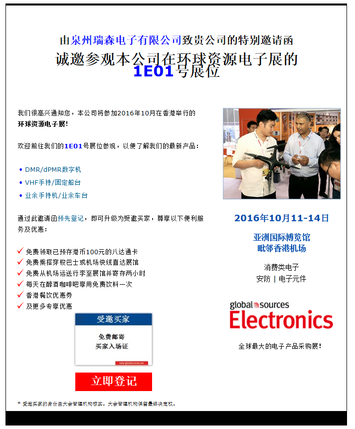 泉州瑞森電子有限公司誠(chéng)邀您參觀(guān)2016年10月環(huán)球資源電子展,攤位號(hào)1E01 ...